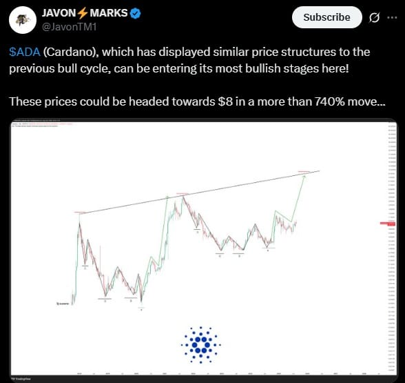 Obserwując altcoin w ostatnich miesiącach, trudno o optymizm. Jednak Javon Marks przeprowadził analizę porównawczą wykresów ADA, doszedł do intrygującego wniosku. Popularny na X ekspert wskazał, że Cardano prezentuje strukturę cenową podobną do poprzedniego cyklu wzrostów. Dlatego według Marksa ADA może być u progu największej hossy.