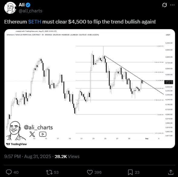 Z kolei Ali Martinez wskazał kluczowy warunek, który musi być spełniony, by ETH znowu zaczął rosnąć. Według analiz Martineza Ethereum musi „wyczyścić” poziom 4500 USD, by myśleć o przywróceniu byczego trendu. Mówiąc wprost, token musi utrzymać się przez dłuższy czas na poziomie co najmniej 4500 USD, by wytworzyć dogodne warunki do odbicia.
