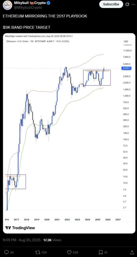 Popularny na X ekspert ds. rynku kryptowalut ocenił, że obecny cykl wzrostów i spadków jest bliźniaczo podobny do tego z 2017 roku. Dlatego ocenił, że Ethereum odzwierciedla tamte ruchy. Według jego szacunku kryptowaluta, jeśli powtórzy historię, to może osiągnąć nawet 9 tys. dolarów.