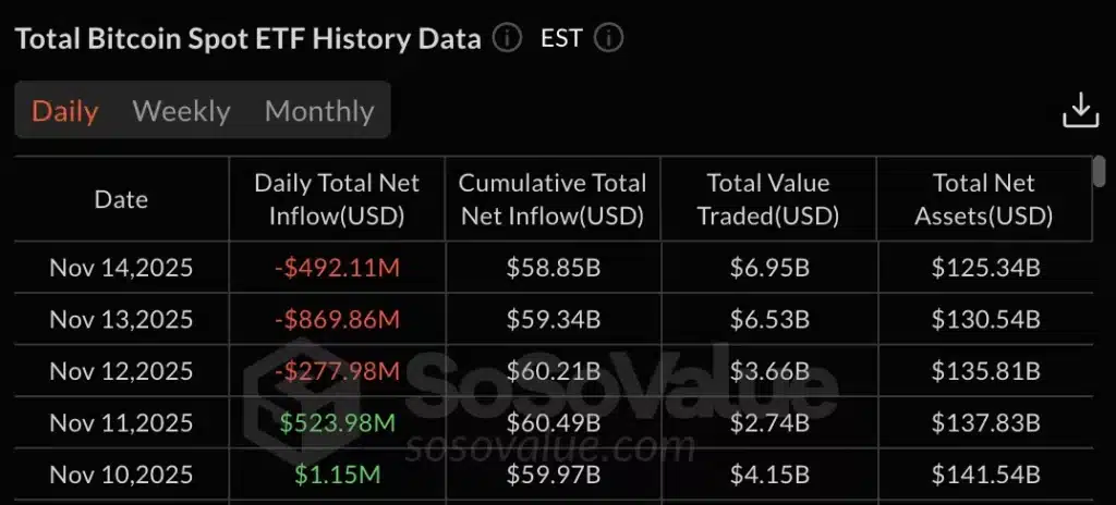 Największy odpływ z Bitcoin ETF-ów miał miejsce 13 listopada – aż 869,86 mln USD, po czym 14 listopada rynek zanotował kolejne 492 mln USD ujemnych przepływów.