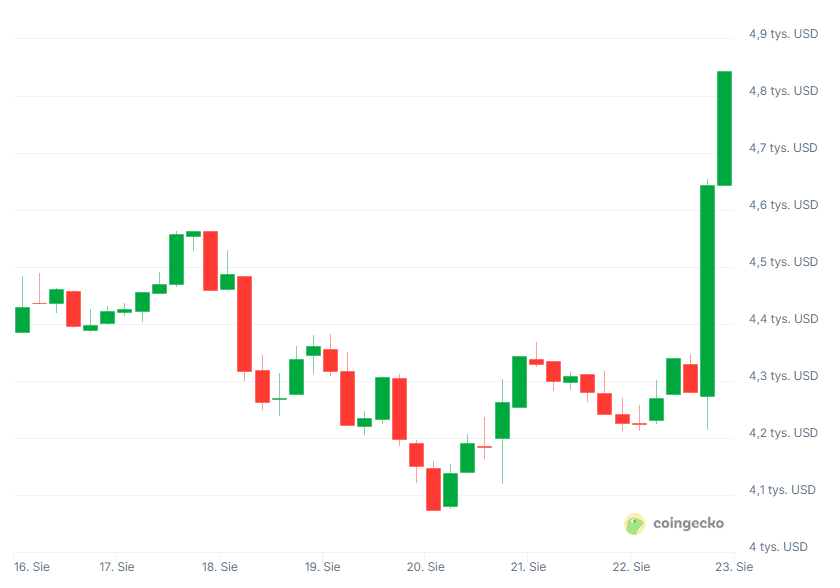 Ethereum (ETH) w piątek wieczorem wystrzeliło ponad poprzedni rekord z 2021 r., notując nowe ATH w okolicach 4,88–4,90 tys. dol. w zależności od giełdy. „Winne” są najnowsze newsy makroekonomiczne prosto z ust prezesa banku centralnego USA (Fedu) na temat ceny pieniądza oraz kilka innych czynników. Jak daleko zagna kryptowaluta Vitalika Buterina na koniec tego rajdu?