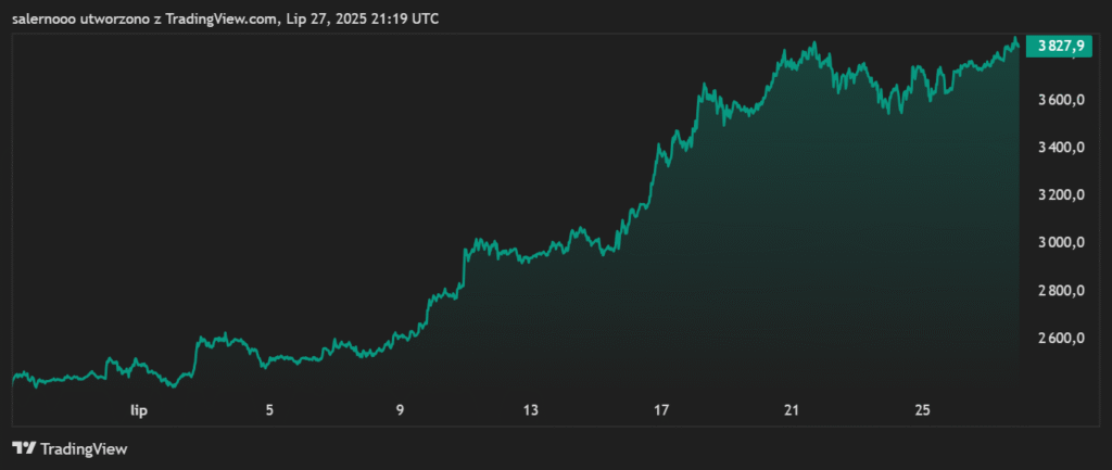 Ethereum w ciągu ostatnich 30 dni zrobiło +51%. Cena skoczyła z nieco ponad 2,5 tys. dolarów do (w momencie pisania tego artykułu) ponad 3800 dolarów. Dla wielu – jeszcze szał. Dla niektórych – już znak ostrzegawczy. Bo kiedy na X’ie, Instagramie i Redditach robi się za głośno, często kończy się to szybkim zjazdem. Czy pozytywny sentyment na światową kryptowalutę numer dwa się przegrzewa? Tak, według niektórych.