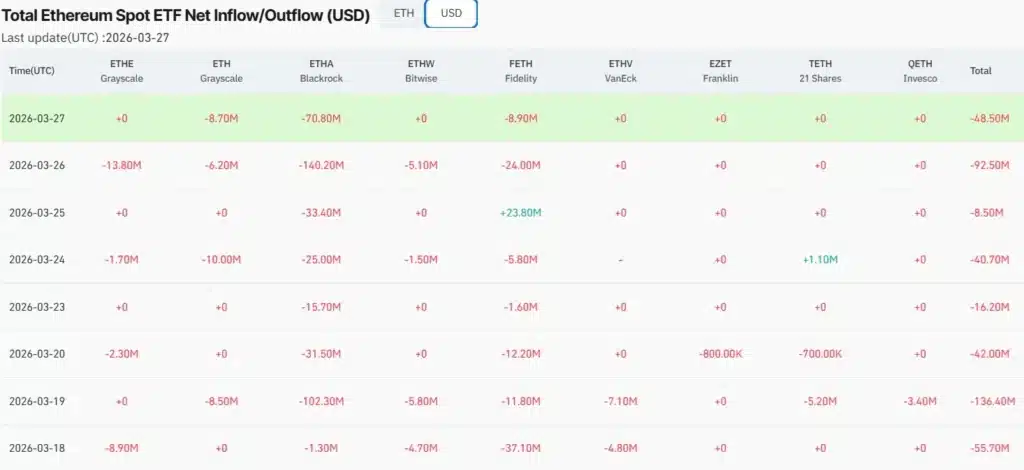 Fundusze spotowe Ethereum ETF zanotowały osiem dni z rzędu z ujemnym przepływem kapitału. W dniach od 18 do 27 marca z ETF-ów powiązanych z Ethereum łącznie odpłynęło 383 640 USD. Największy jednodniowy odpływ pojawił się w czwartek 19 marca. Wówczas tylko w ciągu jednej sesji z rynku zniknęło 136,40 mln USD. Od początku istnienia wszystkie fundusze spotowe Ethereum ETF zgromadziły ponad 11,52 mld dolarów kapitału.