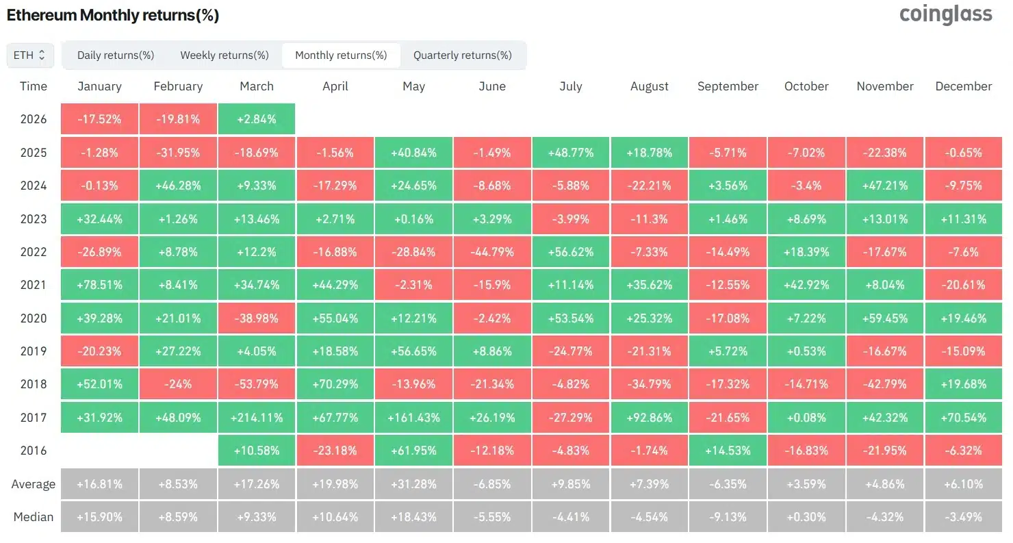 Wówczas ETH nieprzerwanie tracił na wartości od maja do listopada. Największy miesięczny spadek token zanotował w listopadzie (-42,79%). Podobnie nieudany okres token zaliczył między grudniem 2024 a kwietniem 2025 roku, kiedy altcoin spadła przez pięć kolejnych miesięcy. Na ten moment Ethereum notuje 2,84% wzrost w ujęciu miesięcznym. Jednak sytuacja na rynku kryptowalut zmienia się bardzo dynamicznie i utrzymanie tego wyniki do końca miesiąca nie jest takie oczywiste.