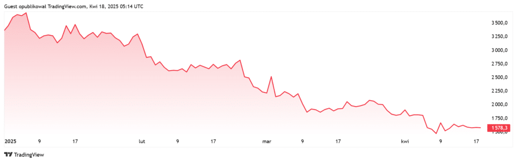 Od czasu wprowadzenia ceł przez administrację Trumpa, amerykańskie fundusze spotowe oparte na Etherze straciły łącznie aż 909 milionów dolarów. Co więcej, wartość netto aktywów w tych funduszach skurczyła się o ponad 60% – z historycznego szczytu 14,28 miliarda dolarów w grudniu, do zaledwie 5,25 miliarda. To sygnał wyraźnego odwrotu inwestorów instytucjonalnych od ETH. I jednocześnie poważny hamulec dla wzrostów ceny, jeden z wielu.