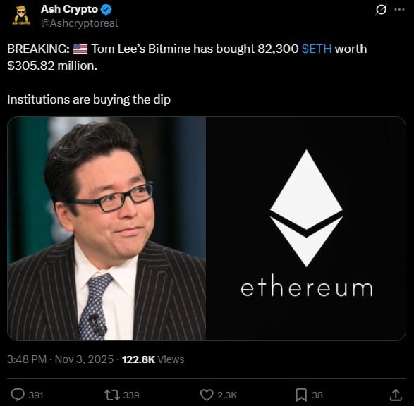 Takie znaczące ruchy uaktywniają wieloryby. Jedne w panice sprzedają, inne wyczuwają okazję i kupują po niższej cenie. Co zrobił największy publiczny posiadacz Ethereum, czyli BitMine Immersion? Okazuje się, że firma, na której czele stoi Tom Lee, nie zamierza się zatrzymywać.