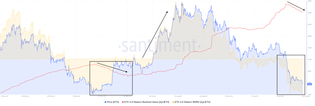 Coraz więcej analityków zwraca uwagę na dane on-chain. 30-dniowy wskaźnik MVRV – mierzący relację między kapitalizacją rynkową a zrealizowaną wartością tokenów – zaczął rosnąć. Historycznie taki ruch często pojawiał się w pobliżu lokalnych minimów. Wzrost MVRV oznacza, że inwestorzy zaczęli kupować ETH po niższych cenach, podnosząc średni koszt nabycia tokenów w obiegu. Podobny schemat obserwowano w kwietniu 2025 r., tuż przed odbiciem z poziomu 1 400 dolarów. Dodatkowo rośnie aktywność stakingowa. Coraz więcej nowo zakupionych tokenów trafia do kontraktu stakingowego sieci, co zmniejsza podaż w wolnym obrocie. W krótkim terminie może to stworzyć warunki do tzw. szoku podażowego.
