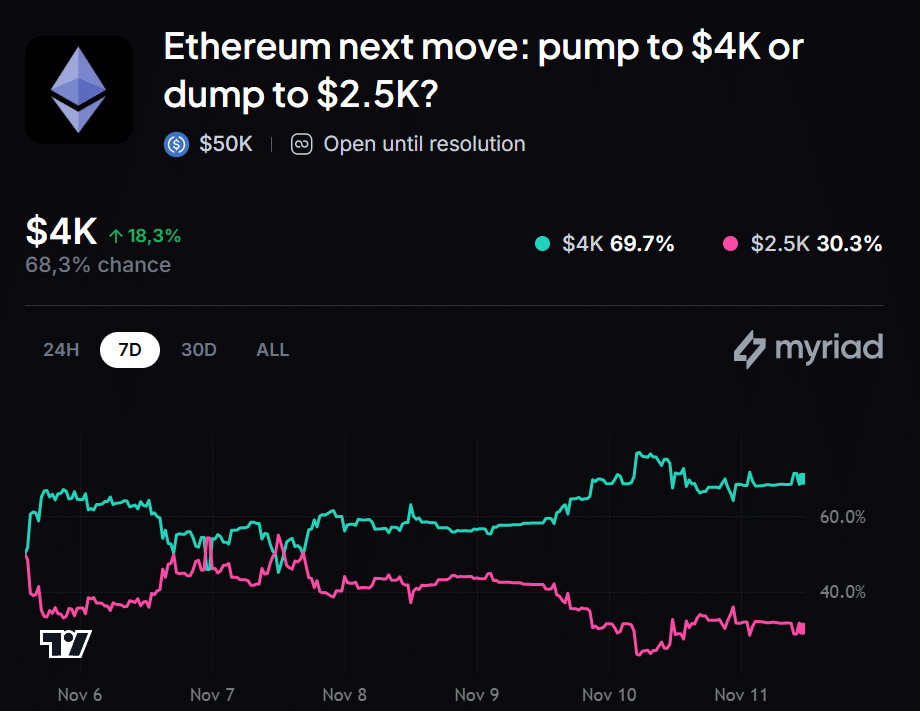 Jeśli ktoś traktuje rynki predykcyjne jak papierek lakmusowy, to i tutaj są dobre wiadomości. Aż 71% społeczności Myriad Markets uważa, że ETH prędzej ponownie zaliczy 4000 dolarów niż spadnie do 2500.