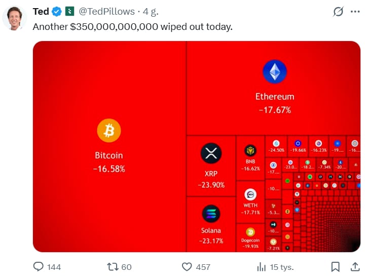 Podobnego zdania jest Tom Lee, który wskazuje, że niepewność polityczna w Waszyngtonie przekierowała kapitał w stronę metali szlachetnych, mimo że te również borykały się z chwilową zmiennością. Ekspert Benjamin Cowen ostrzega z kolei przed scenariuszem, w którym Bitcoin mógłby spaść nawet do poziomu 35 000 USD, jeśli obecna struktura rynkowa nie zostanie utrzymana. Z kolei analityk o pseudonimie Ted Pillows zauważył, że utrata kluczowych średnich kroczących na wykresie tygodniowym często historycznie zwiastowała testowanie okolic 68 400 USD.