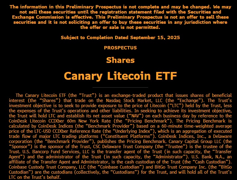Trzeba przyznać, że REX-Osprey działa niezwykle sprawnie. W lipcu wypuścił ETF na Solanę, teraz XRP i Dogecoin, a w kolejce stoją już kolejne produkty… Od BNB po egzotyczne projekty pokroju Bonka czy Trump token. Analitycy zwracają uwagę, że SEC wciąż zwleka z ostatecznymi decyzjami dotyczącymi kilkudziesięciu innych wniosków. W grze są m.in. Avalanche, Hedera, czy Litecoin (wniosek widoczny niżej).