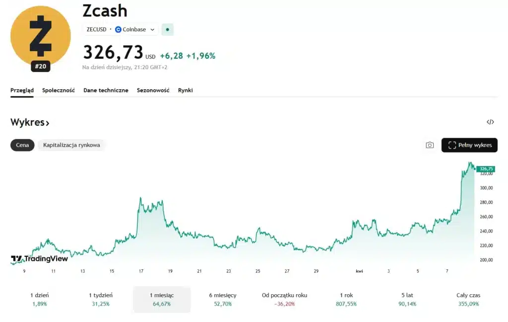 Jednym z takich tokenów jest Zcash. ZEC w chwili pisania tekstu kosztuje 326 USD, a w ciągu ostatnich 24 godzin spadł o 1,89%. Natomiast w ujęciu tygodniowym i miesięcznym token zyskał na wartości odpowiednio 31,25% oraz 64,67%. Jednak wciąż jest co odrabiać, ponieważ od początku roku (Year To Date) ZEC traci 36,20%. Mimo wszystko od początku krachu z października altcoin zyskał na wartości 52,70%.