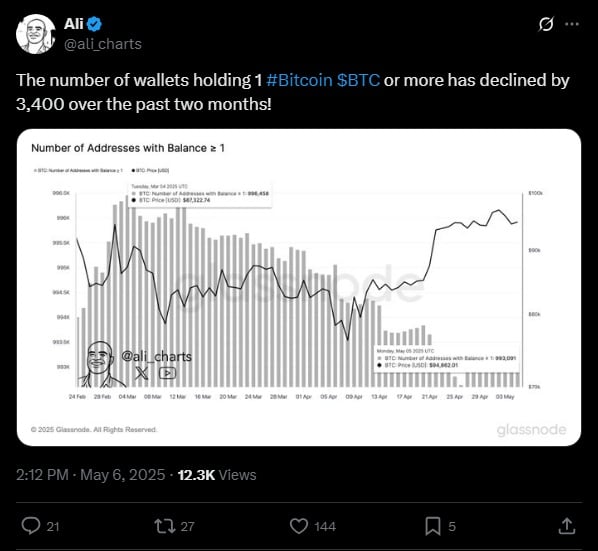 Jak ustalił Ali Martinez w jednym z najnowszych postów na X liczba portfeli, które przechowują jeden lub więcej BTC spadła w ciągu ostatnich dwóch miesięcy aż o 3400. Wydaje się, że to skrajny scenariusz, ale jeśli ten trend się utrzyma, to możemy dojść do momentu, w którym giganci przejmą większość Bitcoinów dostępnych na rynku.