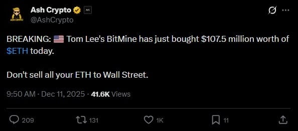 W całym poprzednim tygodniu gigant kupił 138 452 tokenów. Tym samym zwiększył swoje całkowite zasoby do 3,86 miliona Ethereum. Na tym gigant nie zakończył swoich zakupów. Jak wynika z danych platform śledzących wieloryby, kilka godzin temu BitMine dokupiła ETH za 107,5 mln dolarów.