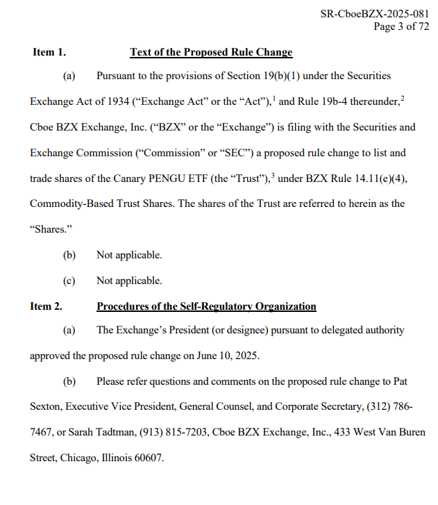 W myśl formularza 19b-4, jaki Cboe BZX złożyła w SEC, jej ETF miałby inwestować swoje środki w memecoina Pudgy Penguins (PENGU). Kryptowaluta ta, oparta na blockchainie Solany i opatrzona wizerunkami sympatycznych animowanych pingwinów, jest produktem kryptoowalutowego funduszu kapitałowego Canary Capital. Canary, z siedzibą w Nashvillle w stanie Tennessee, sama złożyła nieomal miesiąc temu podobny wniosek do SEC o zgodę na ETF z PENGU w roli głównej.