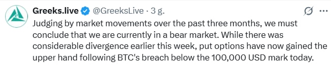 Adam Chu, główny badacz platformy analitycznej GreeksLive, stwierdził, że „sądząc po ruchach rynkowych w ciągu ostatnich trzech miesięcy, musimy dojść do wniosku, że obecnie znajdujemy się na rynku niedźwiedzia”. Dodał, że pomimo obecności znacznej dywergencji w sentymencie inwestorów, opcje put zyskały przewagę po przebiciu przez Bitcoina poziomu 100 000 USD.