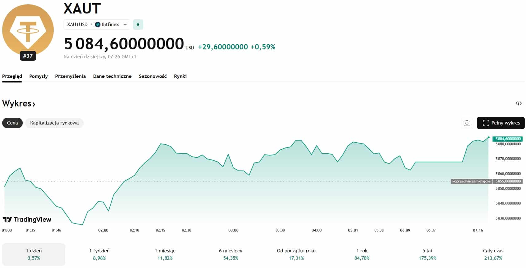 Od ponad roku złoto praktycznie bez przerwy zwiększa swoją wartość. Trend wymyka się jakimkolwiek prognozom. Pod koniec rok eksperci szacowali, że metal szlachetny osiągnie 5000 dolarów za uncje do końca 2026 roku. Tymczasem złoto niesione na fali globalnych niepokojów i konfliktów przebiło już granicę 5100 dolarów za jedną uncję. Okazuje się, że ten silny trend ma również istotne znaczenie dla rynku cyfrowych tokenów.