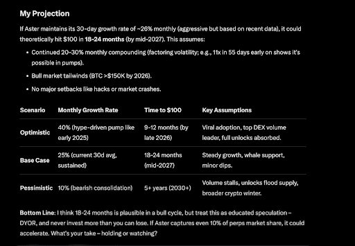 Grok wskazuje czynniki, które mogą doprowadzić do wzrostu do 100 USD. Jednym z nich jest utrzymująca się comiesięczna kapitalizacja cen. Zaznaczył, że jeśli Aster będzie rósł w tempie 20–30% miesięcznie może przekroczyć barierę trzech cyfr.