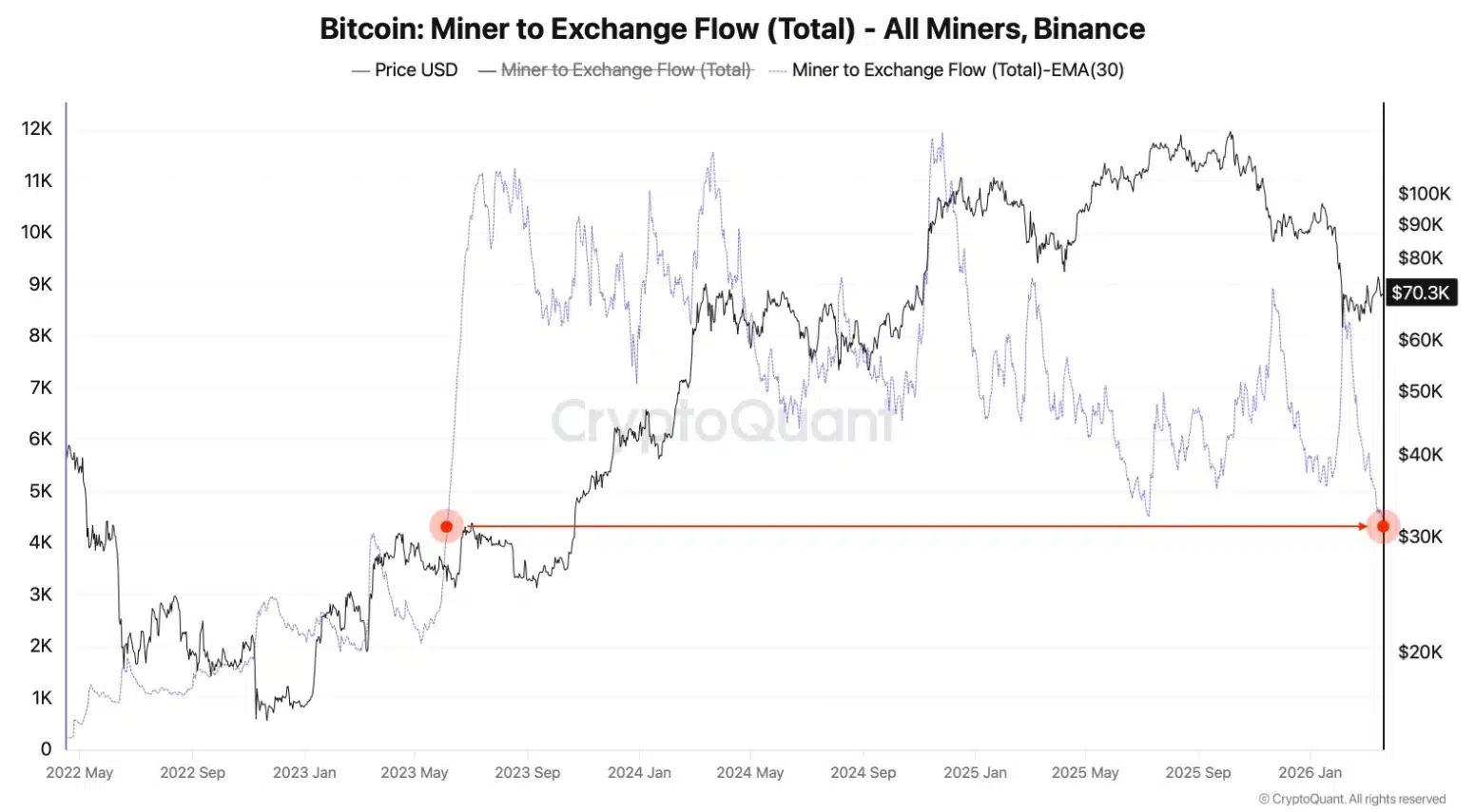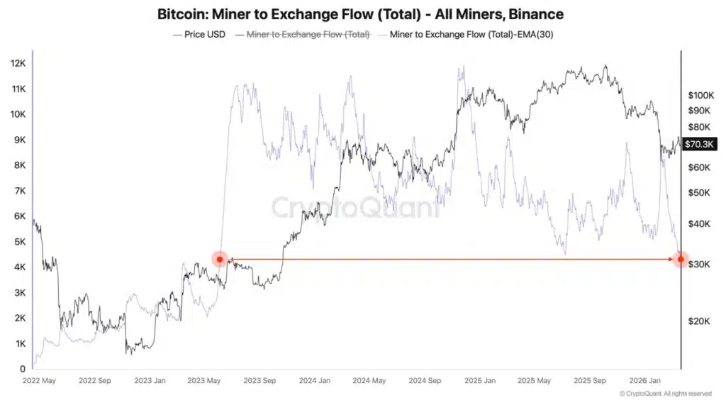 Wgląd w najnowsze odczyty wykresu Miner to Exchange Flow prowadzi do interesujących wniosków. To wskaźnik on-chain, który pokazuje ilość Bitcoinów przesyłanych bezpośrednio z portfeli górników na giełdy. Po zauważalnym wzroście dostaw na giełdy na przełomie stycznia i lutego obecnie napływ od górników spada do rekordowo niskich poziomów. Trend wyraźnie się odwrócił i obecnie średni miesięczny napływ BTC od górników do Binance wynosi około 4316 BTC. Ostatni raz podobne odczyty notowano 5 czerwca 2025 roku.
