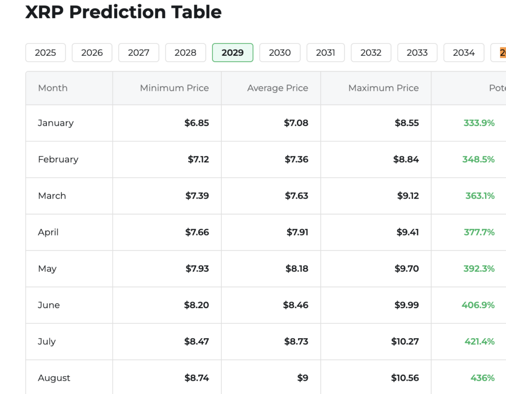 Changelly prognozuje, że XRP może osiągnąć 10 USD do sierpnia 2029 r. Podobny pogląd podziela Bitwise, prognozując cenę wzrostową na poziomie około 10,20 USD do 2029 r. Bardziej optymistyczny scenariusz zakłada cenę 13 USD do 2028 r.