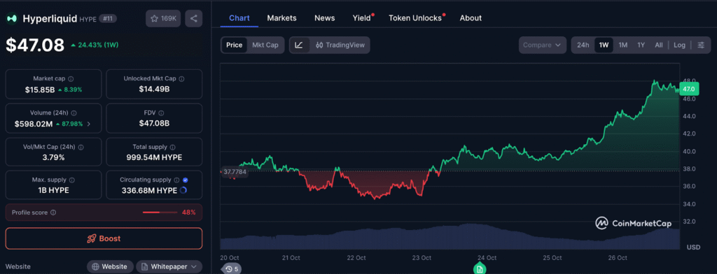 Akcje Hyperliquid (HYPE) wzrosły o 7,98% w ciągu 24 godzin. Napędzane nowym notowaniem na Robinhood i rosnącą aktywnością na zdecentralizowanej platformie instrumentów pochodnych. Otwiera to dostęp dla HYPE dla ponad 23 milionów. Użytkownicy Robinhood natychmiast zwiększają płynność i przejrzystość.