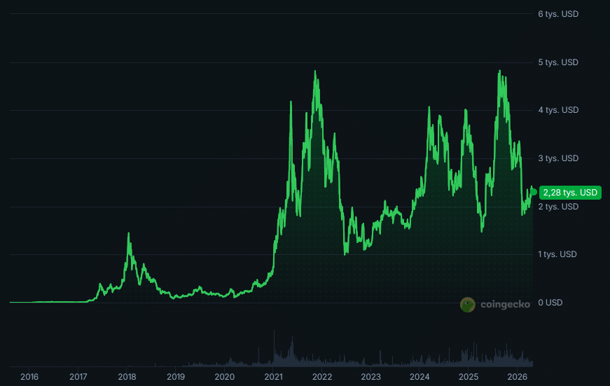 Ethereum wyceniane jest dziś na około 2315 dolarów. W punkcie startowym analizy, w ostatnich dniach kwietnia 2021, kurs wynosił około 2545 dolarów przy kapitalizacji rynkowej przekraczającej 288 miliardów USD. Różnica to minus dziewięć procent w ujęciu nominalnym. Gdyby ktoś przez pięć lat trzymał gotówkę pod materacem, wynik byłby identyczny – tyle że przynajmniej bez ryzyka.