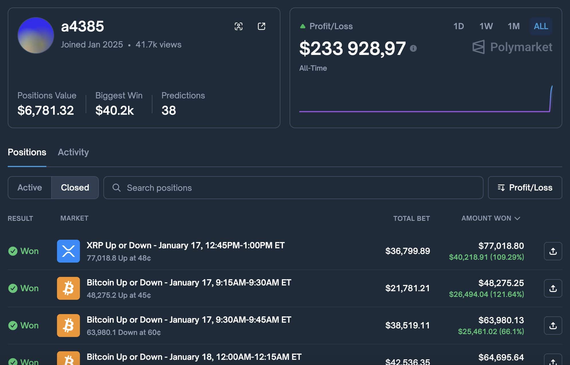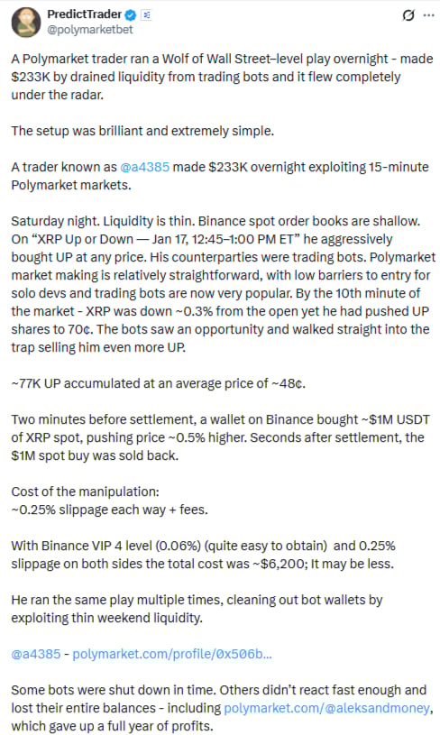 W miniony weekend anonimowy inwestor XRP posługujący się pseudonimem a4385 zdołał zarobić około 233 000 USD, wykorzystując niską płynność oraz luki w algorytmach botów obsługujących platformę predykcyjną Polymarket.