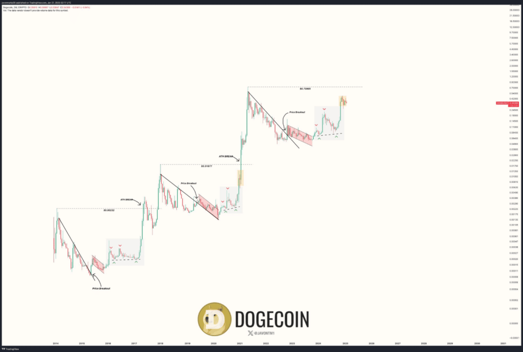 Zamieszczony wykres podkreśla konsekwentny wzrost ceny DOGE po dużych wybiciach, sprawiając, że jest to jedno z najczęściej obserwowanych aktywów.