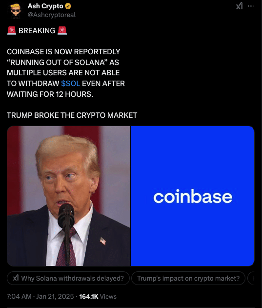 Chociaż kryptowaluta Solana wykazuje siłę, stoi w obliczu poważnego problemu. Raporty mówią, że na Coinbase „zabrakło Solany”. Użytkownicy nie są w stanie wypłacić tokenów SOL, nawet po odczekaniu 12 godzin. Wywołało to zaniepokojenie wśród osób korzystających z portfeli Solana.
