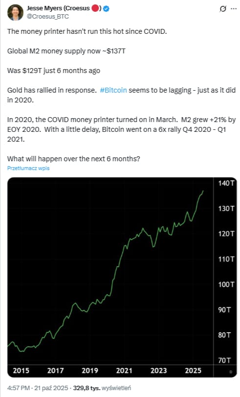 Wzrost podaży M2, który odnotowano ostatnio, jest największy od czasów pandemicznego dodruku, co budzi skojarzenia z okresem, po którym cena BTC wzrosła aż sześciokrotnie, prowadząc do osiągnięcia historycznych szczytów. Współzałożyciel Onramp Bitcoin, Jesse Myers, podzielił się na platformie X.com danymi, które wskazują, że globalna podaż M2 wynosi obecnie około $137 bilionów, wzrastając o $8 bilionów, czyli 6,2%, w ciągu zaledwie sześciu miesięcy od marca bieżącego roku. To tempo jest najwyższe od początku pandemii COVID-19, choć wciąż ma pewien dystans do 21-procentowego wzrostu, który nastąpił do końca 2020 roku.