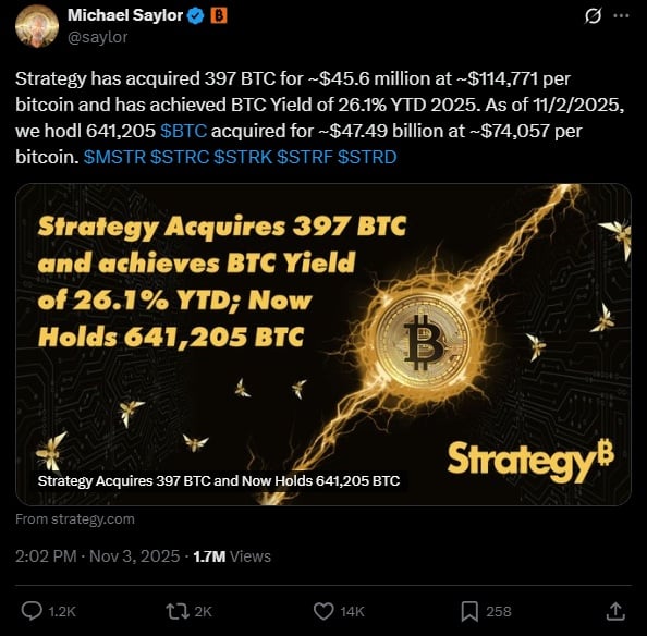 Ważny sygnał dla posiadaczy Bitcoina wysłał Michael Saylor. Na początku tego tygodnia jego MicroStrategy przekazało na X, że spółka dokupiła 397 BTC za około 46 mld dolarów. Za każdy token gigant zapłaciły około 114 tys. USD. Po tej transakcji podmiot posiada w swoim portfelu już 641 205 BTC. Na wszystkie monety firma wydała 47,49 mld USD po cenie 74 057 USD. Tym samym, chociaż kryzys widać gołym okiem, gigant wysłał jasny sygnał, że wierzy w długoterminowy potencjał Bitcoina.