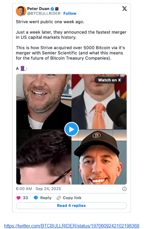 Nie bez znaczenia są też ruchy konsolidacyjne. We wrześniu Strive ogłosił przejęcie Semler Scientific, łącząc łącznie ponad 11 000 BTC. Trend jest jasny – instytucje nie tylko kupują, ale też centralizują posiadane zasoby, ograniczając dostępność monety w obiegu.