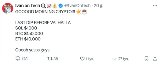 Liljeqvist, posługujący się pseudonimem IvanOnTech, w poście opublikowanym na platformie X śmiało prognozuje, że Solana może osiągnąć pułap 1000 dolarów, Bitcoin wzrośnie do 150 000 dolarów, a Ethereum osiągnie imponującą wartość 10 000 dolarów.