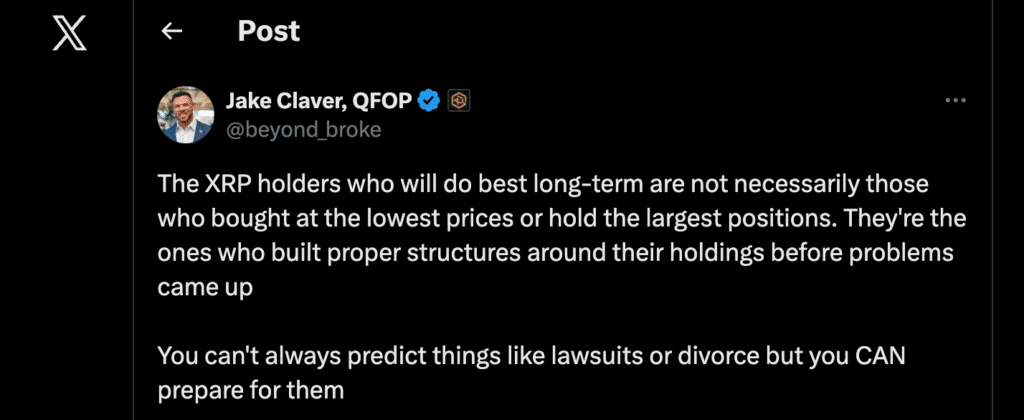 Jake Claver, dyrektor generalny Digital Ascension Group, wierzy, że największe sukcesy na rynku XRP nie odniosą ci, którzy kupili je po najniższych cenach lub zgromadzili największe ilości. Zamiast tego, zwycięzcami będą ci, którzy zbudują silne bezpieczeństwo i struktury prawne, zanim pojawią się problemy.