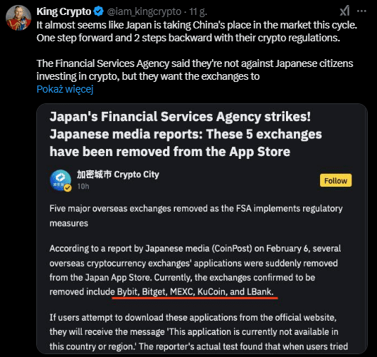 Co byś zrobił, gdyby Twoja ulubiona giełda krypto nagle wyparowała z internetu? Taki scenariusz właśnie rozrywa się w Japonii. Użytkownicy próbujący pobrać aplikacje Bybit, KuCoin, Bitget, MEXC czy LBank zderzają się tylko z lakonicznym komunikatem.: „Ta aplikacja nie jest dostępna w Twoim kraju lub regionie”.