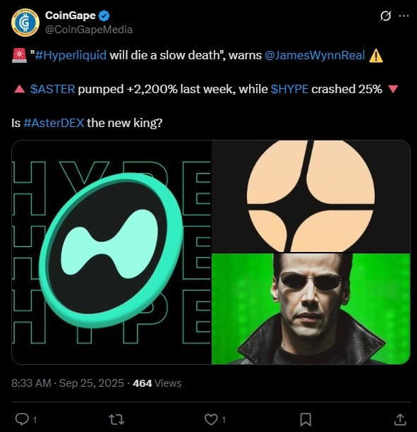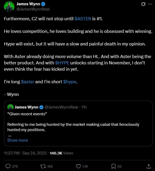 James Wynn, popularny trader, stwierdził, że CZ jest bardzo zdeterminowany, by wynieść Aster na szczyt rynku. Jednak wejście na szczyt wymaga ofiar, a największe straty według eksperta poniesie HYPE. Trader spodziewa się, że konkurencyjny DEX Hyperliquid ostatecznie upadnie. Jak ocenił Wynn „HYPE będzie istniał, ale moim zdaniem czeka go powolna i bolesna śmierć”.