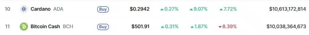 Wyraźnie wzrosła również kapitalizacja projektu. W ciągu doby całkowita kapitalizacja rynkowa ADA wzrosła z 9,3 do 11,28 mld dolarów. To, przy słabszych wynikach Bitcoin Cash, pozwoliło wyprzedzić rywala i odzyskać pozycję w TOP 10. Jednak sytuacja nie jest stabilna, ponieważ w chwili pisania tekstu różnica między ADA a BCH wynosi nieco ponad 0,5 mld dolarów. Na rynku kryptowalut to strata, którą można odrobić w ciągu kilku godzin.