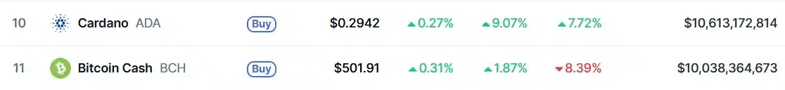 Wyraźnie wzrosła również kapitalizacja projektu. W ciągu doby całkowita kapitalizacja rynkowa ADA wzrosła z 9,3 do 11,28 mld dolarów. To, przy słabszych wynikach Bitcoin Cash, pozwoliło wyprzedzić rywala i odzyskać pozycję w TOP 10. Jednak sytuacja nie jest stabilna, ponieważ w chwili pisania tekstu różnica między ADA a BCH wynosi nieco ponad 0,5 mld dolarów. Na rynku kryptowalut to strata, którą można odrobić w ciągu kilku godzin.