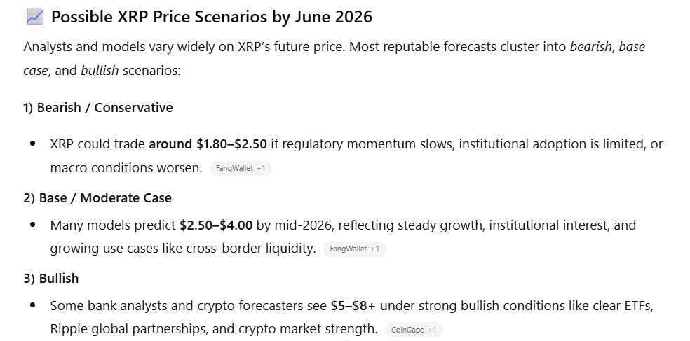 Z kolei ChatGPT przedstawia trzy scenariusze dla XRP do połowy 2026 r. W przypadku scenariusza pesymistycznego przewiduje, że cena XRP wyniesie około 1,80$–2,50$. Argumentuje to ograniczonym przyjęciem i pogarszającymi się warunkami makroekonomicznymi.