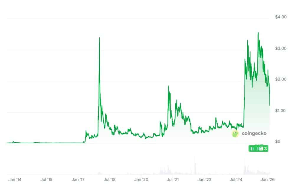 XRP wchodzi w 2026 rok w bardzo trudnym położeniu. Po dynamicznych wzrostach w poprzednich cyklach coin Ripple’a ponownie znalazł się głęboko w bessie, znajdując się w rejonie 1,30–1,45 USD. To ponad 70% poniżej historycznego ATH z 2018 roku (3,84 USD) i wyraźnie poniżej lokalnych szczytów z 2025 r. Pytanie, które dziś dominuje wśród inwestorów, brzmi czy poziom 3 USD jest jeszcze realny – i jeśli tak, to kiedy? Być może ten materiał stanowi na nie odpowiedź.