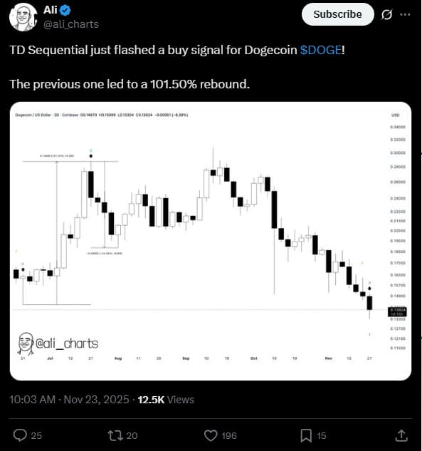 Wygląda to nie najlepiej, ale są pewne sygnały, że trend się odwróci. Ali Martinez w jednym z najnowszych postów na X podzielił się wynikami swojej analizy. Doświadczony ekspert ustalił, że wskaźnik TD Sequential właśnie wysłał sygnał kupna dla Dogecoina. Jak dodał Martinez, kiedy w przeszłości wskaźnik układał się w podobny sposób, to DOGE odbił aż o 101,5%. Jeśli historia się powtórzy, to cena memecoina wzrośnie do około 0,28 USD za monetę.