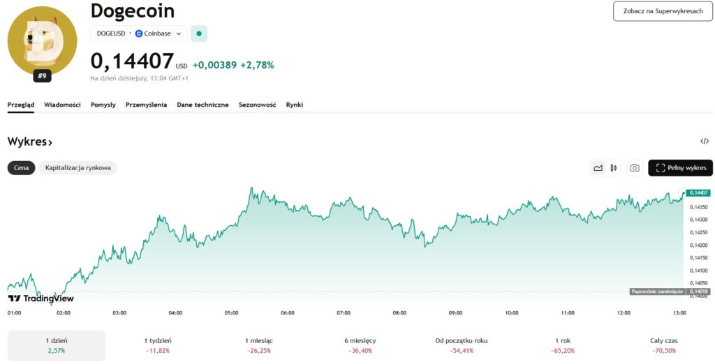 Najpopularniejszy memecoin spadł do tego samego poziomu, który prezentował dokładnie rok temu przed startem hossy po zwycięstwie Donalda Trumpa. W chwili pisania tekstu token kosztuje 0,14 USD, a w ciągu ostatnich 24 godzin zyskał 2,57%. W trakcie ostatniego tygodnia, który przyniósł duże spadki dla całgo rynku, DOGE spadł o 11,82%. Z kolei w ujęciu miesięcznym kryptowaluta straciła 26,25%. Bardzo niepokojąco wygląda wskaźnik YTD (Year To Date). Od początku roku Dogecoin stracił na wartości 54,41%.