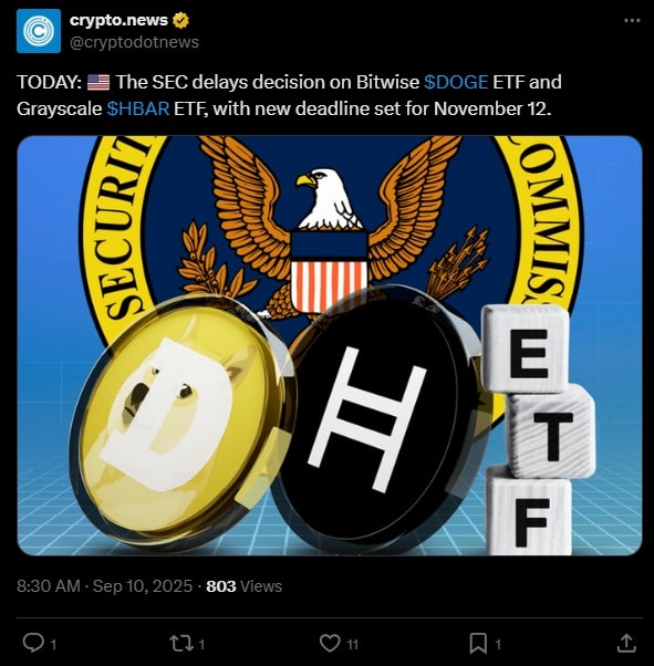 Chodzi o Dogecoina i wnioski dotyczące dopuszczenia do obiegu funduszy spotowych opartych na tym memecoinie. Amerykańska Komisja Papierów Wartościowych i Giełd (SEC) przełożyła decyzję w sprawie zatwierdzenia funduszu Bitwise Dogecoin ETF. Komisja ogłosiła, że ostateczna decyzja zostanie podjęta do 12 listopada 2025 roku. Pierwotny termin przypadał na 13 września.