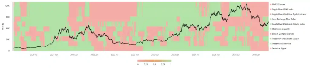 Innymi słowy, wskaźnik przeszedł z fazy niedźwiedziej do neutralnej, co zdaje się potwierdzać koniec bessy sugerowany już wcześniej przez odbicie ceny Bitcoin z okolic 60 000 USD do poziomu 78 000 USD. Dla indeksu, który przez cały ten cykl utknął w obszarze bessy, osiągnięcie poziomu neutralnego jest autentycznym przełomem. Należy pamiętać, że odczyty poniżej 40 punktów sygnalizują strukturalny rynek niedźwiedzia, natomiast wartości powyżej 60 punktów wskazują na silny i trwały trend wzrostowy.