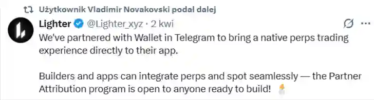 Telegram, jedna z najpopularniejszych platform komunikacyjnych na świecie, wykonała milowy krok w kierunku masowej adopcji zaawansowanych instrumentów finansowych. Dzięki integracji portfela Wallet z zdecentralizowaną giełdą Lighter, ponad 150 mln użytkowników aplikacji zyskało bezpośredni dostęp do handlu kontraktami perpetual futures.