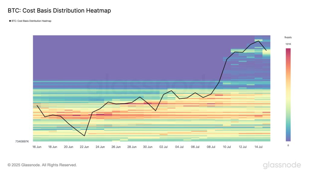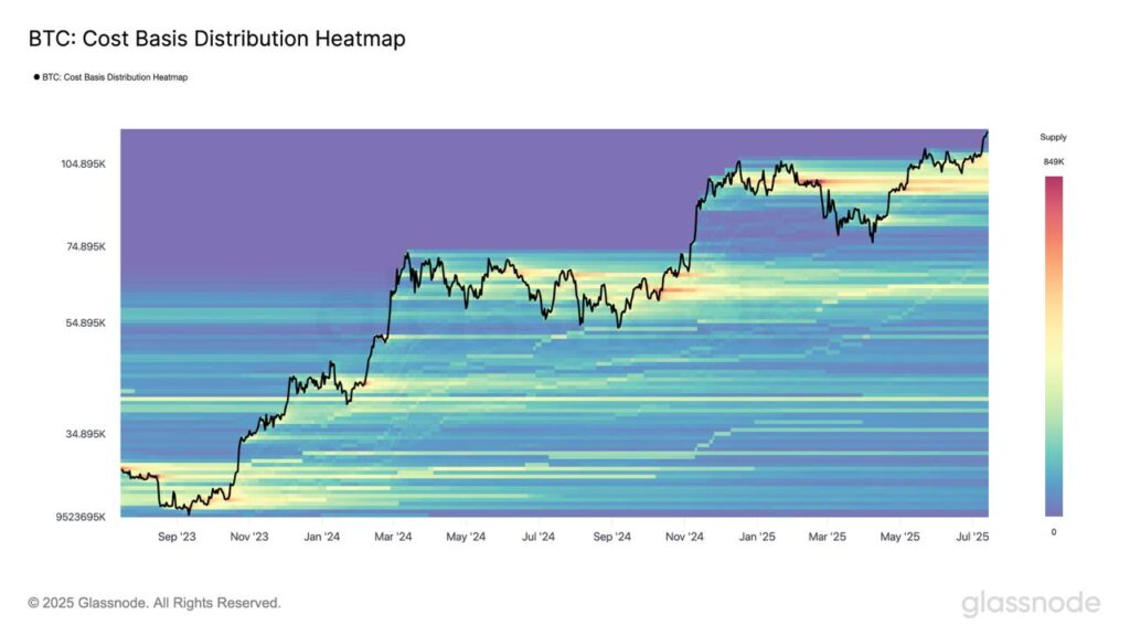 Niedawne wybicie z kilkumiesięcznego przedziału cenowego nastąpiło po utworzeniu gęstych stref akumulacji w przedziałach 93 tys. USD –97 tys. USD oraz 101 tys. USD – 109 tys. USD. To zostało podkreślone na mapie Glassnode CBD Heatmap. Te skupiska podaży prawdopodobnie będą pełnić rolę solidnych poziomów wsparcia w przypadku korekty rynkowej.