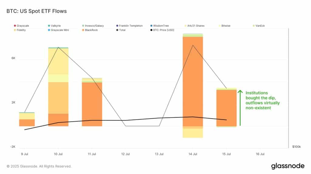 W ten poniedziałek 14 lipca, odnotowano jeden z największych dziennych napływów do amerykańskich spotowych ETF-ów na Bitcoina w ciągu ostatnich trzech miesięcy – aż 7,5 tys. BTC. Jednak to wtorkowa reakcja instytucji przyciąga największą uwagę: nie tylko nie wycofały się z rynku. Wręcz podwoiły zasoby, dokupując kolejne 3,4 tys. BTC. Wypływy z funduszy pozostały natomiast bliskie zeru we wszystkich segmentach. Zatem warunki do hossy pozostają spełnione. Dopóki muzyka na Wall Street gra.