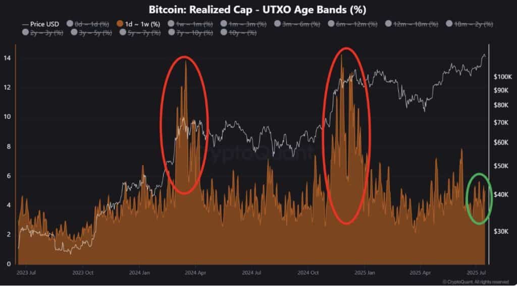 Inwestorzy detaliczni, choć w bloczkach, prawdopodobnie dokładnie liczą każdą złotówkę i dolara… Nadal boją się zainwestować kapitał. Może dlatego, że nie mają go już w nadmiarze. Choć cena BTC wzrosła jeszcze wyżej, wyraźny spadek oznak przegrzania w porównaniu do poprzednich krótkoterminowych szczytów sugeruje, że Bitcoin może kontynuować trend nowych rekordów… Oraz znacząco rosnąć w drugiej połowie 2025 roku, zachowując silny potencjał wzrostowy. Tak uważa CryptoQuant. A co na to Glassnode? Sprawdźmy.