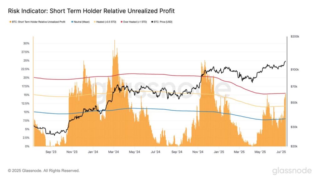 Wraz z przebiciem 120 tys. dolarów, 7-dniowa średnia krocząca wolumenu sprzedaży z zyskiem wśród krótkoterminowych adresów Bitcoina wzrosła do 82%. Czyli znacznie powyżej progu, wskazującego przegrzanie przy 62%. Takie skoki są typowe dla hossy. Glassnode wyjaśnia, że mogą pojawiać się wielokrotnie w trakcie trendu wzrostowego. Ich powtarzanie się na tak wysokim poziomie często poprzedza lokalne szczyty cenowe. Stanowi też sygnał do ostrożności dla nowych inwestorów.