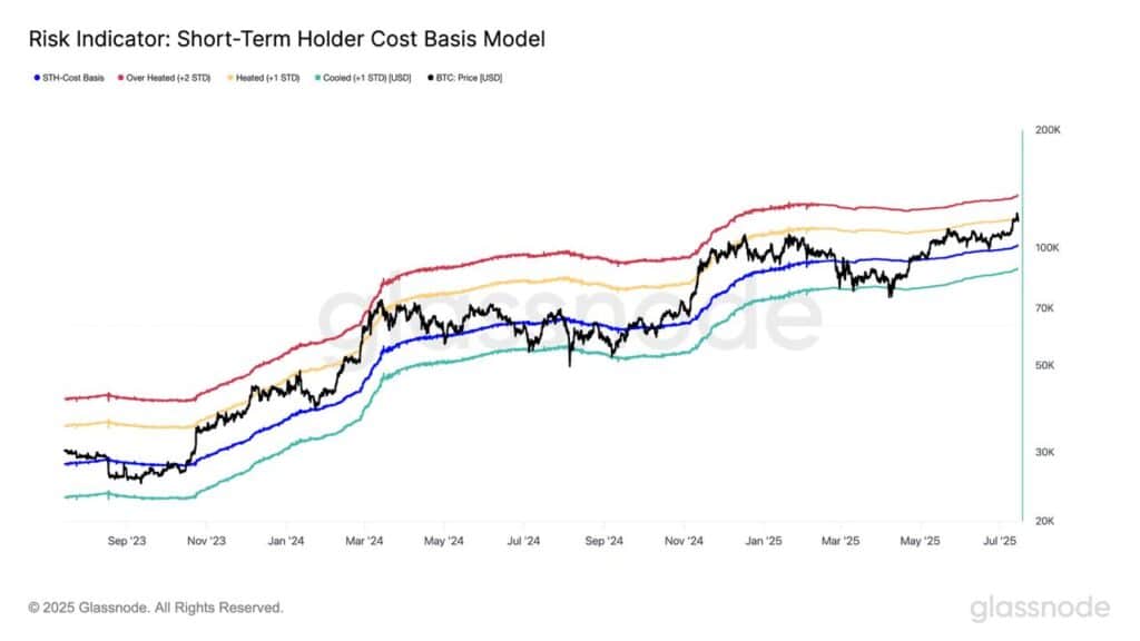 Trwający rajd Bitcoina wywindował cenę do 122 tys. dolarów. Po tym Bitcoin zbliżył się do jednego odchylenia standardowego powyżej średniego kosztu nabycia BTC wśród krótkoterminowych adresów. Jeśli obecna dynamika się utrzyma, kolejnym istotnym poziomem będzie 136 tys. dolarów (2 odchylenia standardowe). Glassnode wskazuje, że to strefa, która historycznie sprzyjała realizacji zysków i lokalnym szczytom rynkowym.