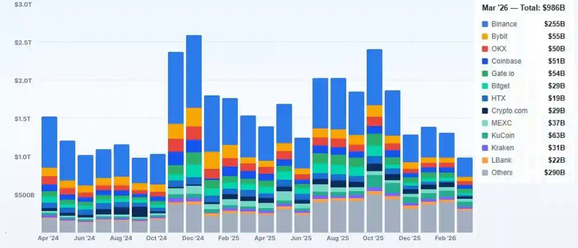 Wolumen obrotu spot na rynku kryptowalut spadł w marcu do poziomu 986 mld USD, co stanowi najniższy wynik odnotowany w ciągu ostatnich dwudziestu czterech miesięcy. Jest to pierwszy przypadek od października 2024 roku, kiedy miesięczna wartość transakcji na głównych giełdach scentralizowanych osunęła się poniżej bariery jednego biliona dolarów.